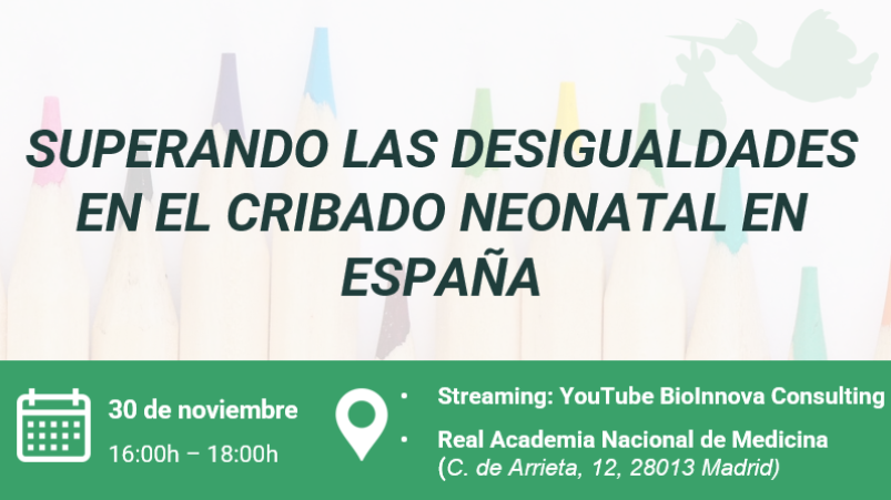 El encuentro "Superando las desigualdades en el cribado neonatal en España" se celebrará el próximo jueves 30 de noviembre en la Real Academia Nacional de Medicina, iniciativa impulsada por BioInnova Consulting y MasVisibles.