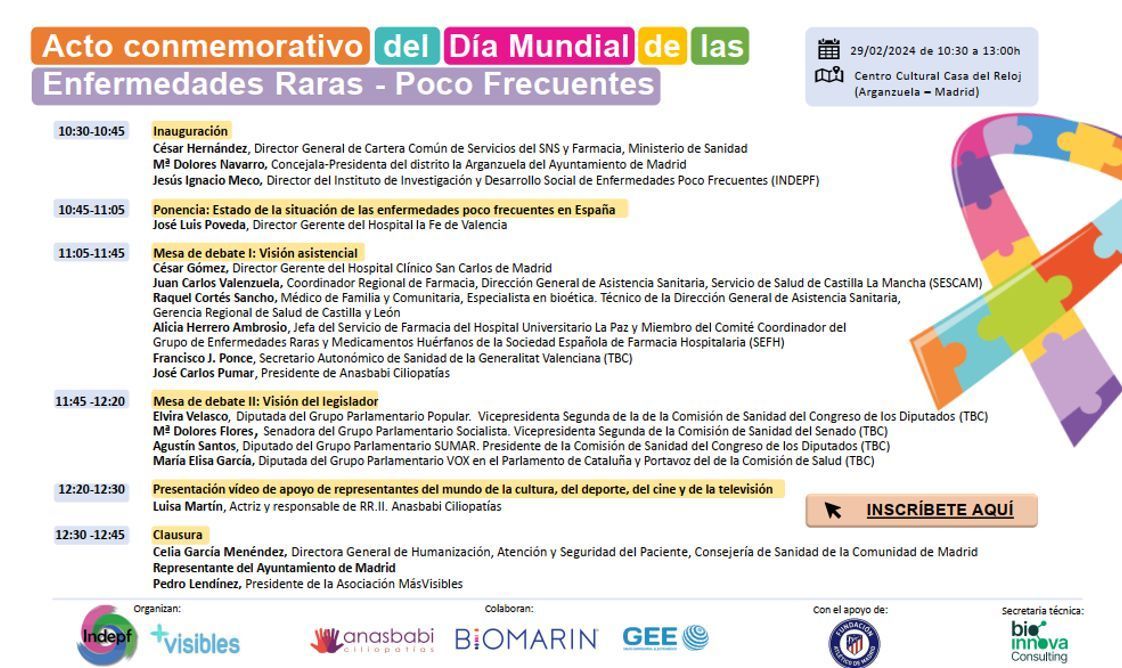 El próximo 29 de febrero tendrá lugar el Acto Conmemorativo del Día Mundial de las Enfermedades Raras - Poco Frecuentes con un programa ambicioso donde se reflejarán las diferentes visiones en torno a estas patologías, tanto desde el ámbito institucional, gestor, político, profesionales sanitarios y pacientes.