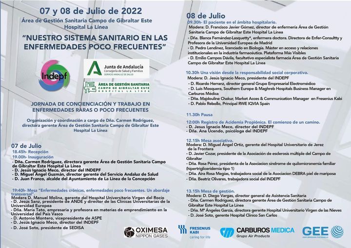 El instituto de Enfermedades Poco Frecuentes, INDEPF, nos ha invitado a participar en el programa de la jornada de concienciación que se celebrará en La Línea de la Concepción (Cádiz) los días 7 y 8 de Julio de 2022